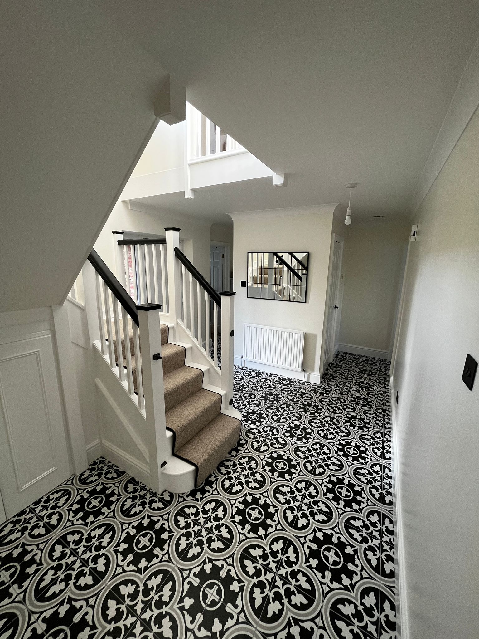 Working with the period style features, we utilised the bold patterned Victorian tiles to introduce a strong theme, extending this up the stairs with the trimmed runner and used the contrast banister rails to tie the overall look together.